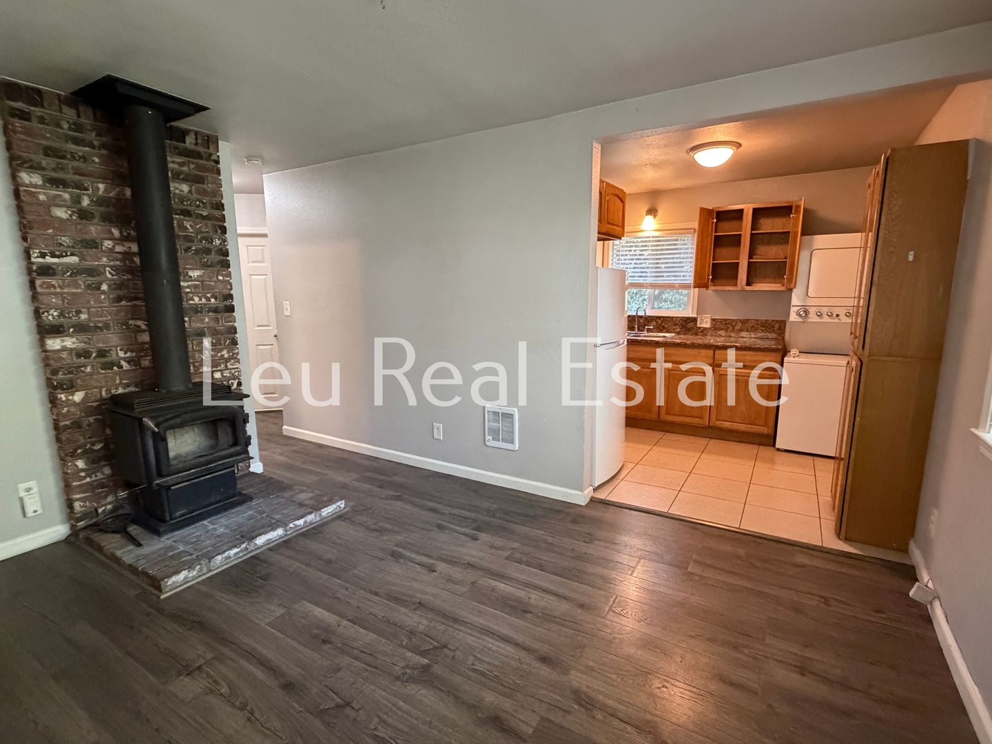 Remodeled 2br/1ba duplex near school and shopping. Kitchen with granite counters, microwave, range & refrigerator and in-unit stackable washer/dryer. Vinyl plank flooring and dual pane windows for energy efficiency. Tiled tub/shower with glass enclosure. Electric wall heaters and wood stove. Storage shed included. Second bedroom is small. Cable and high-speed internet available. Tenant pays electricity & garbage, plus $50 flat fee for water. Offered by Leu Property Management DRE #1860066.
