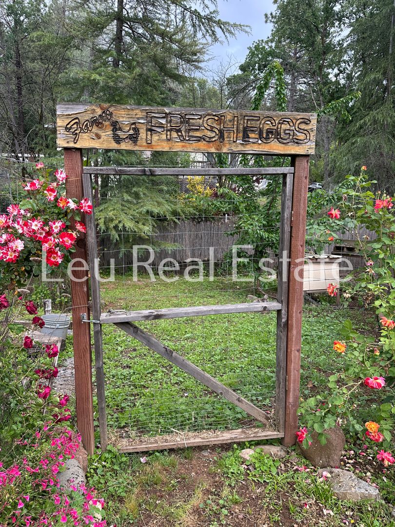 Charming 1938 home with modern updates! This cozy house offers a bright open floor plan, featuring a wood burning fireplace, built-in desk, and window seat. The kitchen is a dream with an island, lots of cabinet space, and modern appliances. Indoor stackable washer dryer. Enjoy comfort with mini-split systems throughout. Step outside to a wraparound deck perfect for entertaining or relaxing. The peaceful backyard includes raised garden beds, fruit trees, a chicken coop, and a spacious concrete patio for gatherings. Beautiful landscaping filled with flowers creates a serene atmosphere. This home blends historic charm with contemporary living—don’t miss out!